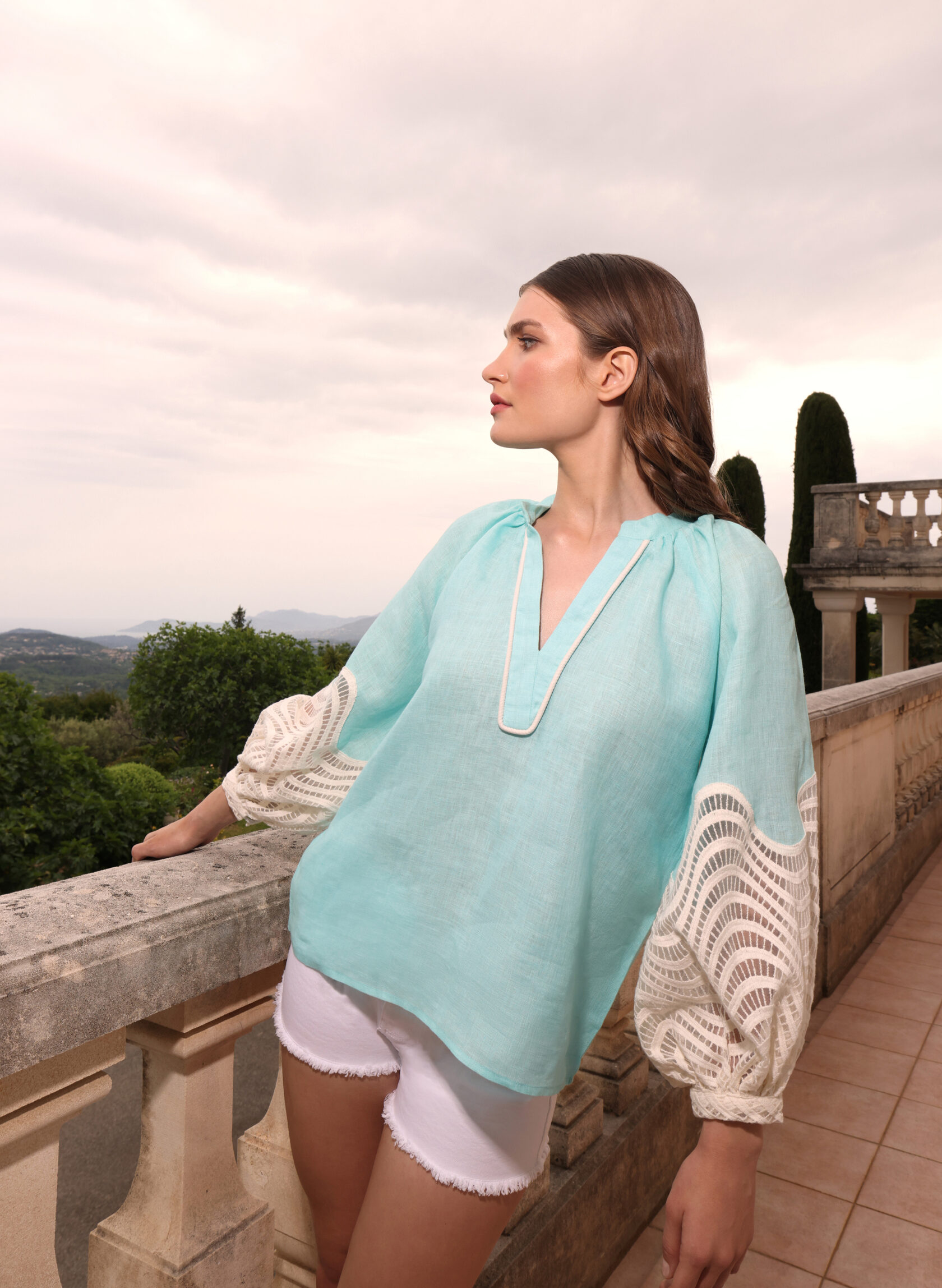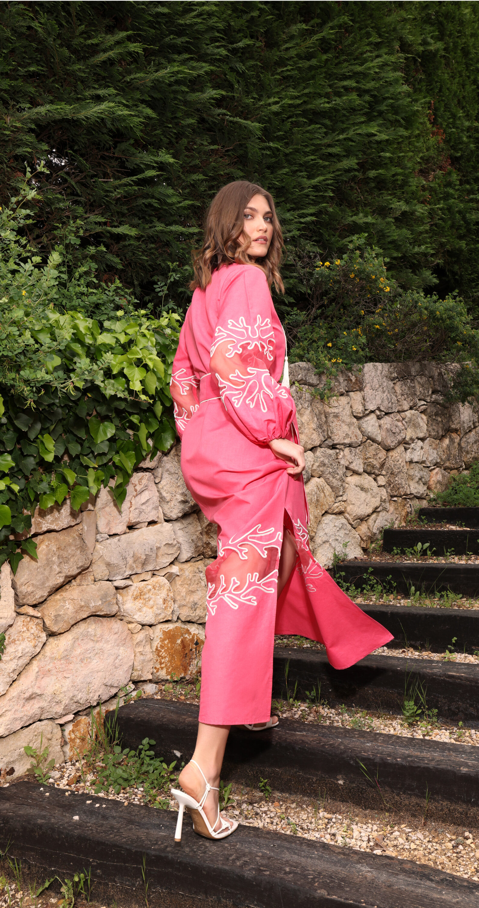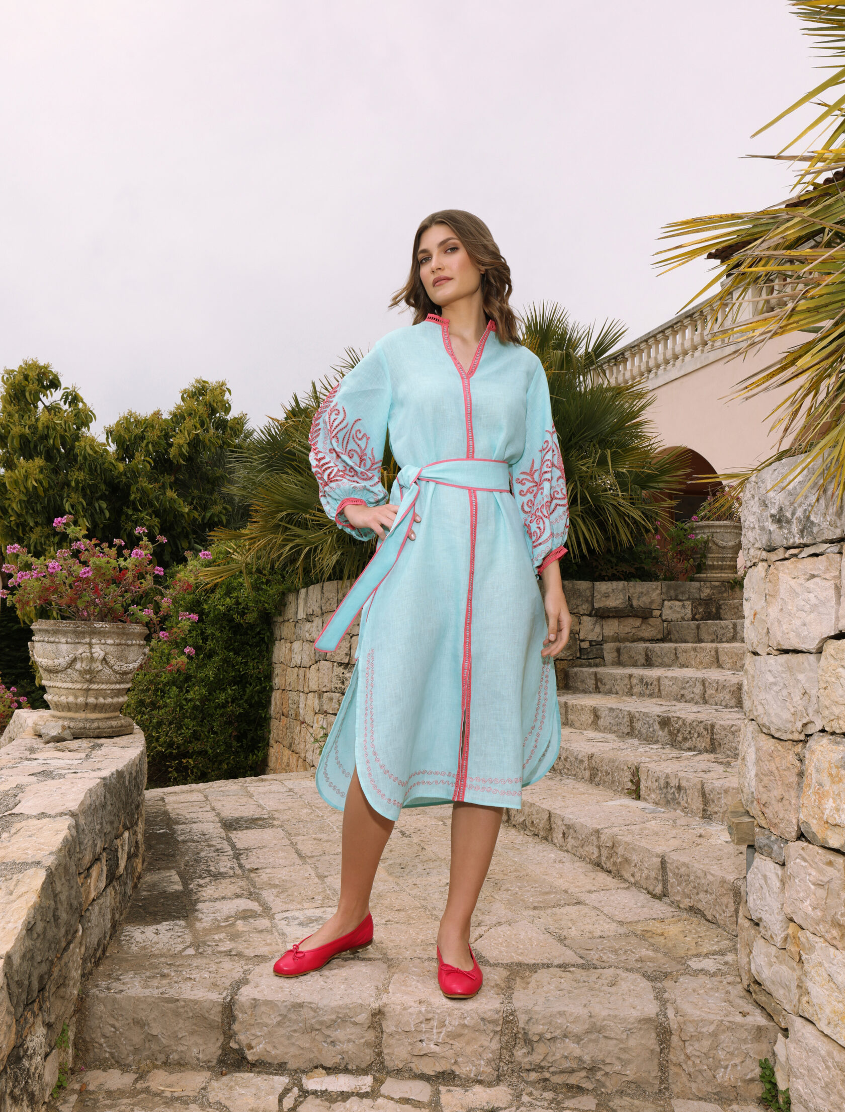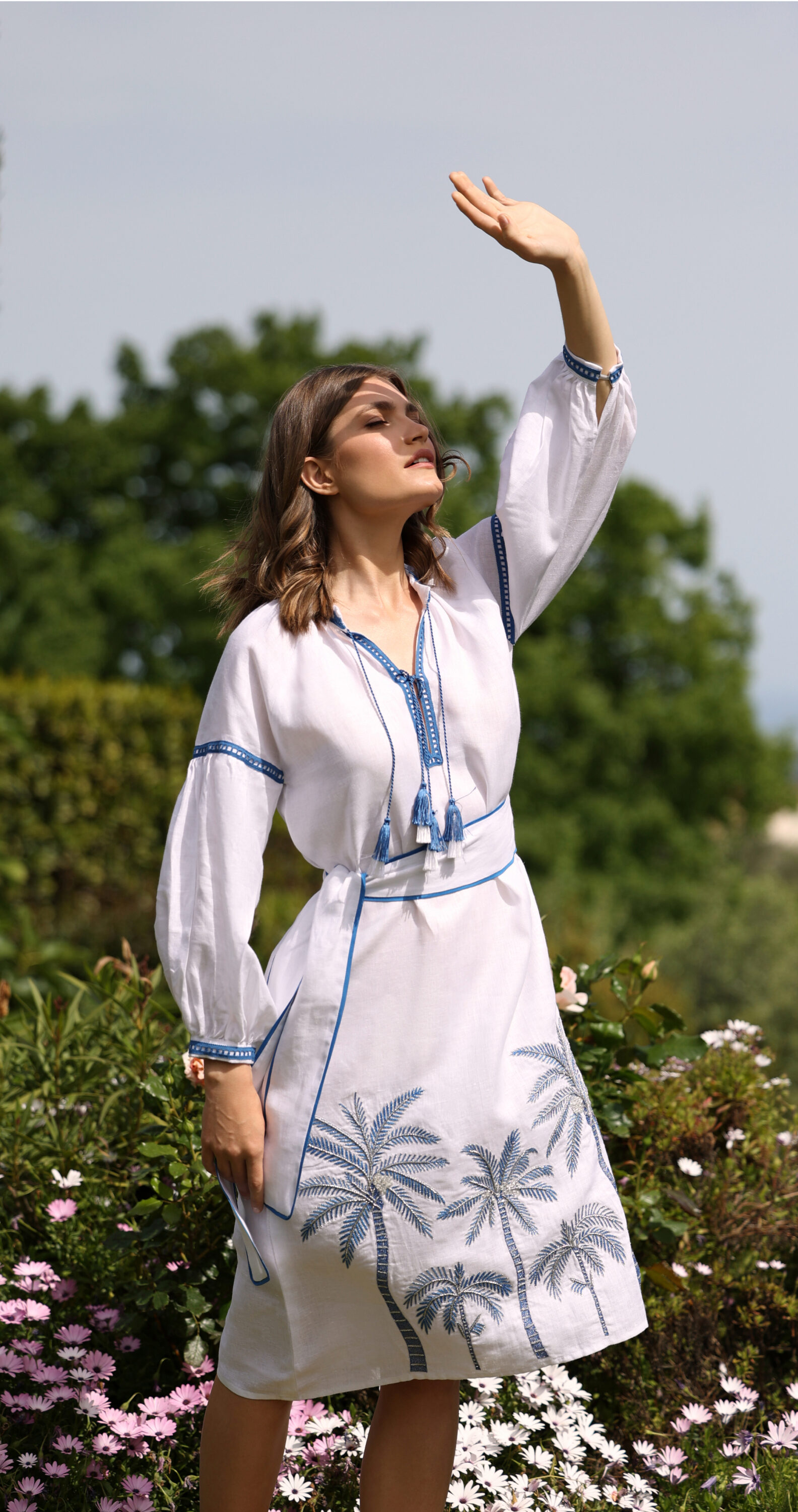 The handmade collection features free-flowing blouses, delicate hand embroidery, and airy dresses that can be cinched at the waist with a detachable belt.